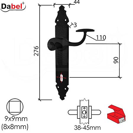 Dimenzije: razmak 90 mm, širina šilda 44 mm, visina 276 mm, debljina 3 mm, dužina ručice 110 mm.