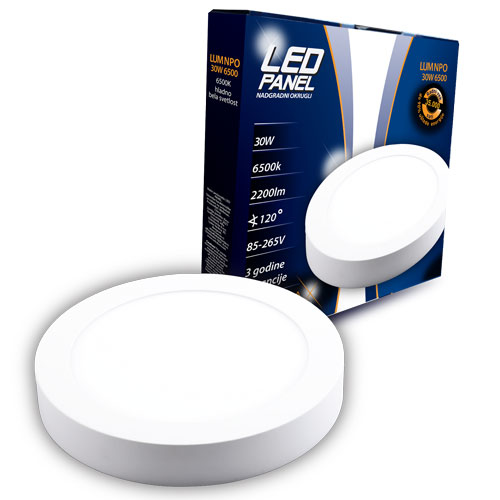 LED panel LUMNPO-30W nadgradni okrugli je snažno i moderno rešenje za osvetljenje većih prostora. Sa snagom od 30W i svetlosnim tokom od 2400 lumena, pruža snažno i ujednačeno osvetljenje koje zamenjuje klasične sijalice visokih snaga. Hladno-bela svetlost od 6500K stvara jasan i intenzivan ambijent, idealan za kancelarije, poslovne prostore, hodnike i stambene objekte.