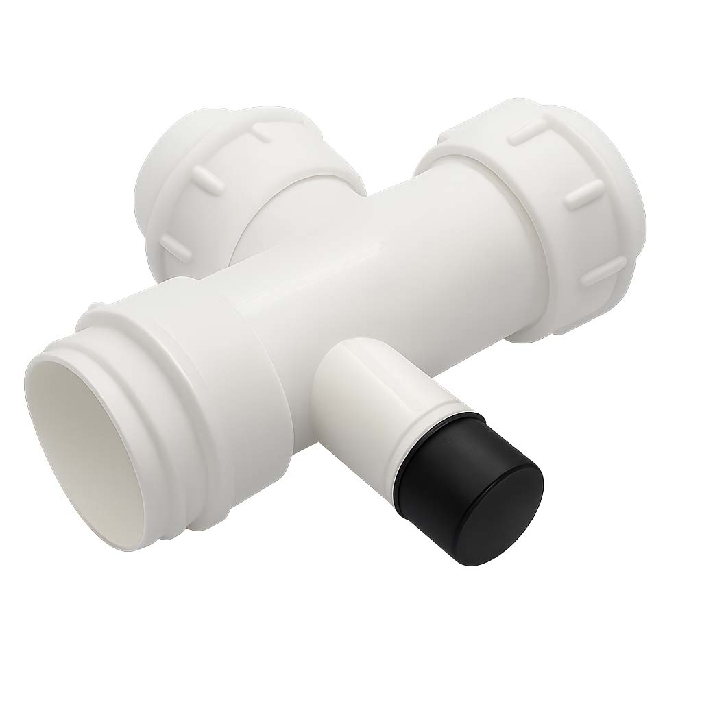 Plastični T komad Ø40 Texo sa priključkom za veš mašinu S00137 izrađen je od kvalitetne plastike, namenjen za ugradnju u odvodne sisteme sudopera ili lavaboa sa dodatnim priključkom za odvod veš mašine. Omogućava jednostavno grananje odvoda i sigurno spajanje bez curenja. Priključak za veš mašinu opremljen je zaštitnim čepom kada nije u upotrebi. Standardni prečnik priključnih otvora omogućava laku kompatibilnost sa PVC cevima Ø40 mm.