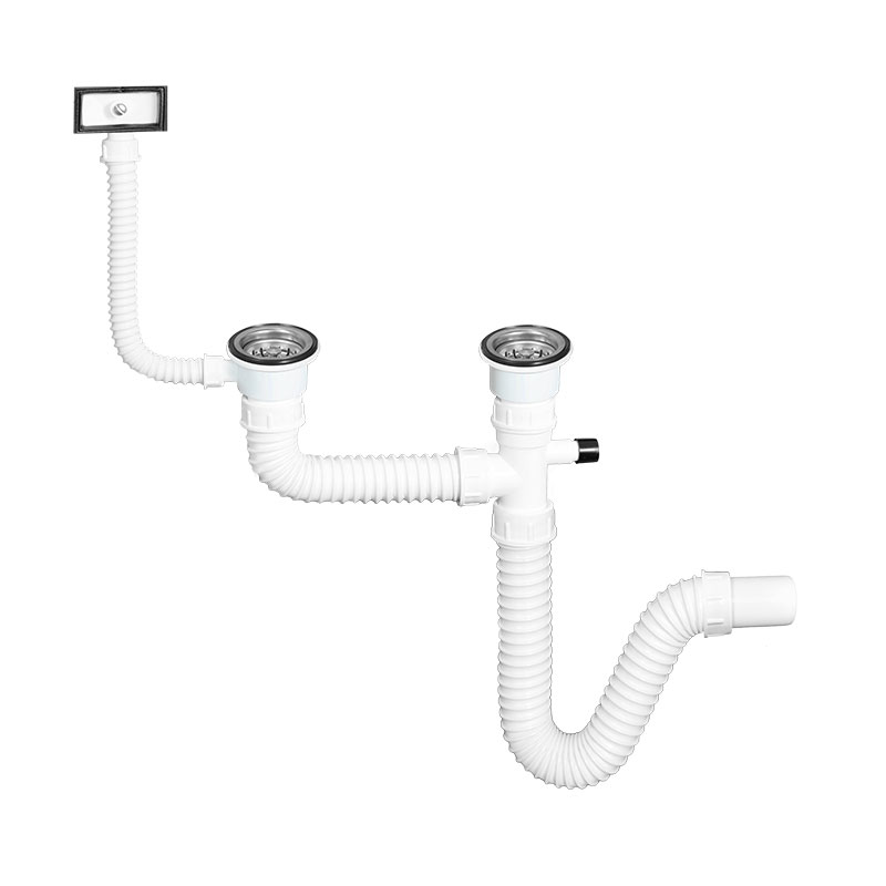 🛁 Fleksibilni sifon za dvodelnu sudoperu ⚪ Dva inox ulivna grla sa rešetkom 🔄 Priključak za mašinu za sudove 💧 Rešetkasti umetak sa funkcijom čepa 📏 PVC cev Ø40 mm glatka iznutra 🛠️ Laka montaža i moderan dizajn